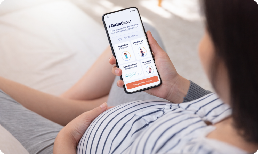 Connectée à son application mobile, Emagina accompagne la préparation à l’accouchement de façon douce, guidée et progressive.